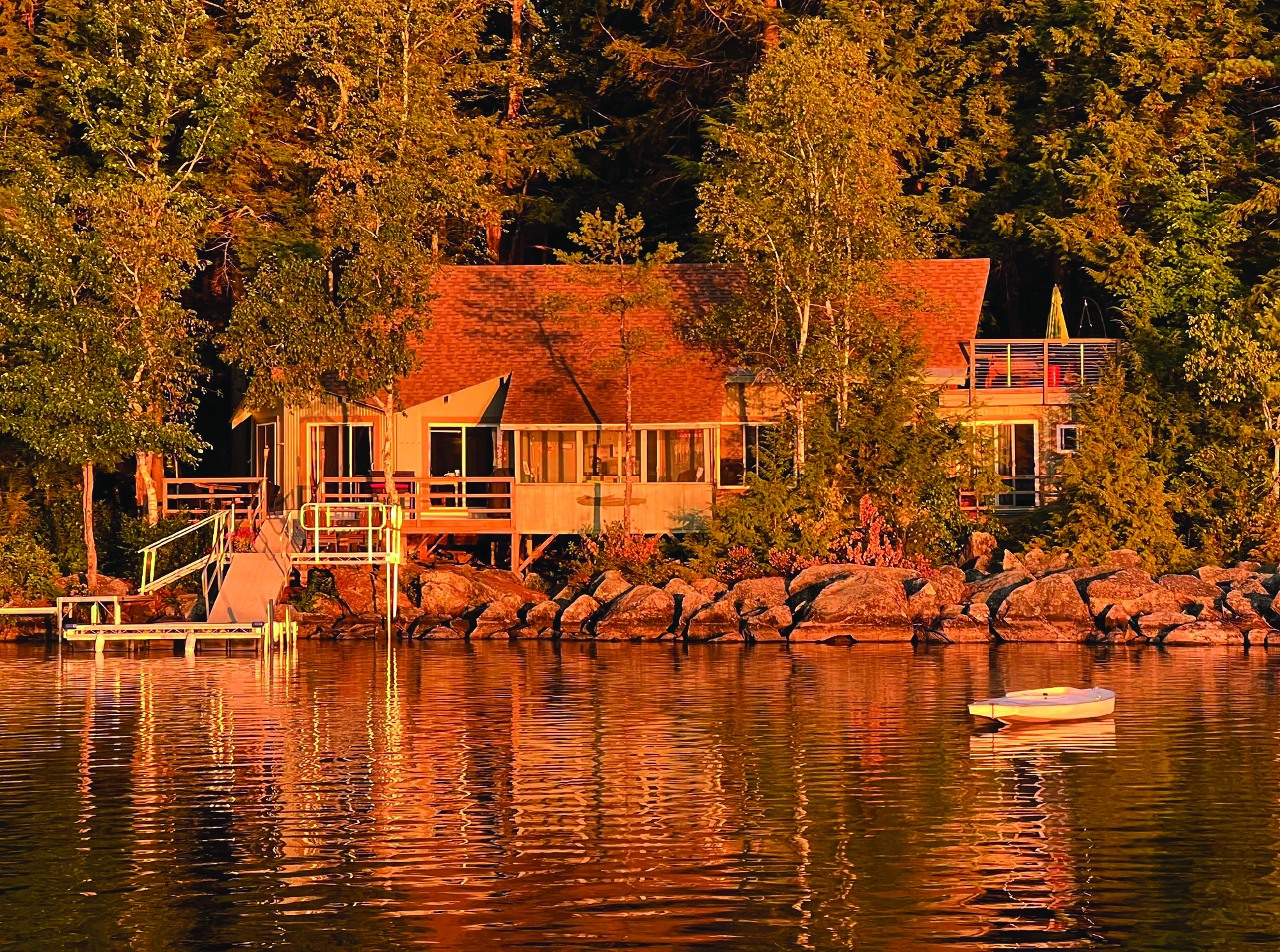 The Temple Camp is a comfortable bungalow nestled in the pines on the shore of Drury Pond. The water-facing side of camp is a wall of European-style windows, creating seamless connection between inside and outside. The camp’s large deck overlooks the path downhill to the water.